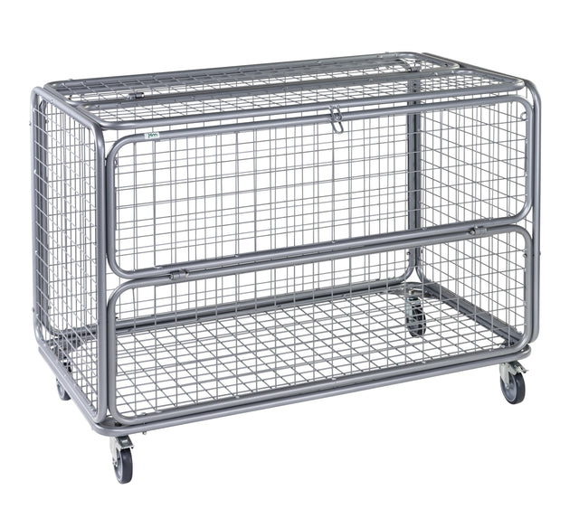 Låsbar (med hänglås) förvarings vagn till leksaker/bollar. Mask storlek 45mm. Levereras med 4st 100 mm länkhjul varav 2st med broms. Halva överdelen öppningsbar.