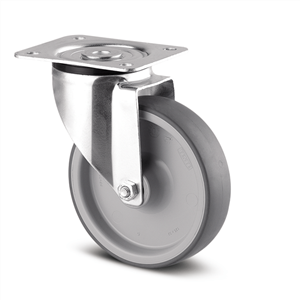 Hölje i pressad stålplåt, blankförzinkad, blåpassiverad, svänghuvud med dubbelkullager, hjulaxel med mutter, dammskydd, fästplatta.